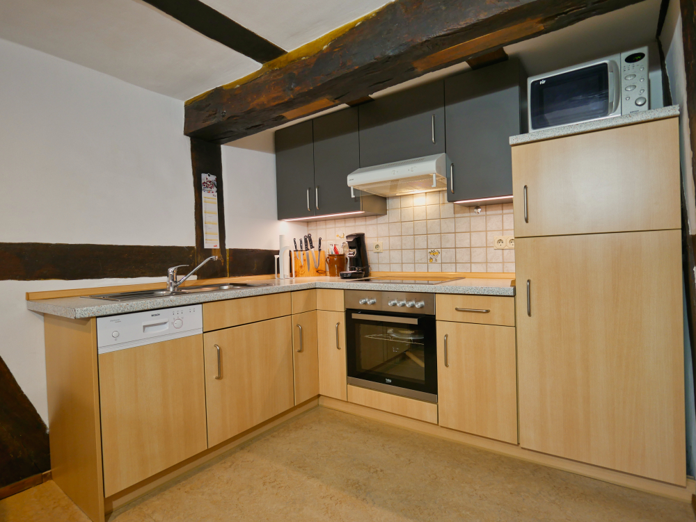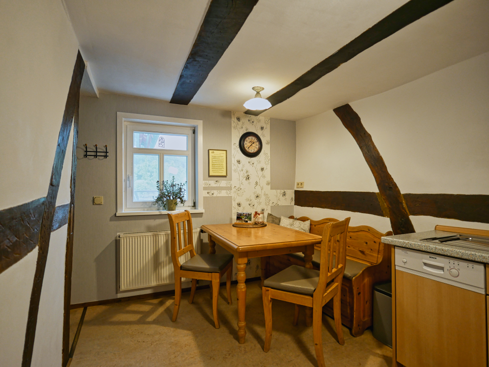 Die Ferienwohnung Schwalbe bietet auf 55 m² mit zwei Schlafzimmern und vier Betten ausreichend Platz für Familien oder vier Erwachsene. Rustikales Gebälk und moderner Wohnkomfort gehen hier eine harmonische Verbindung ein. Auf dem windgeschützten Balkon hat man einen tollen Blick auf die Felder, Wiesen und Wald.