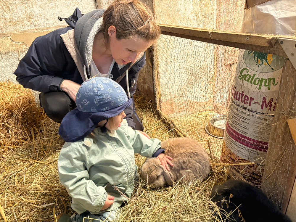 Unsere Rinder im Stall – also die Ammenkühe mit ihren Kälbchen – freuen sich über einen Besuch mit Streicheleinheiten und Futter. Dafür ist immer reichlich Heu und Grassilage vorhanden wie auch das passende „Werkzeug“ für Groß und Klein: Rechen, Schubkarren und Besen.